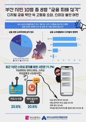 부산시민 10명 중 8명 이상이 금융소비 관련 피해를 ‘심각하다’고 인식하고 있는 것으로 나타났다. 디지털 금융의 확산 속에서 고령층의 소외와 보이스피싱·스미싱에 대한 불안이 여전히 높은 수준을 유지하고 있다는 분석이다.부산소비자단체협의회(회장 김향란)는 지난 7월 부산 시민 315명을 대상으로 실시한 ‘금융소비 인식 및 실태조사’ 결과를 5일 발표했다. 조사에 따르면, 금융피해의 심각성에 대해 ‘심각하다’고 응답한 시민은 82.5%(260명)로, 지난해(75.2%)보다 7.3%p 증가했다.디지털 금융의 영향력에 대해 ‘크다’고 답