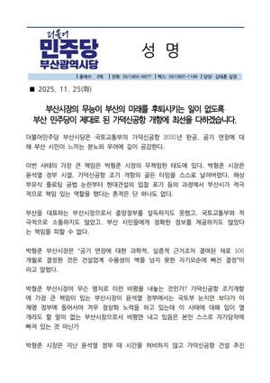 더불어민주당 부산광역시당은 11월 25일 발표한 성명서를 통해 국토교통부의 가덕신공항 2035년 완공 계획에 대해 강한 유감을 표하며, 박형준 부산시장의 무책임한 태도가 공사지연의 핵심 원인이라고 지적했다.민주당 부산시당은 “부산시장이 윤석열 정부 시절 가덕신공항 조기 개항의 골든타임을 스스로 날려버렸다”며, 해상부유식 공법 논란과 현대건설의 입찰 탈락 등 주요 이슈에서 부산시가 적극적인 역할을 하지 않았다고 비판했다.또한 박 시장이 중앙정부를 설득하지 못했고, 국토교통부와의 소통에도 실패했으며, 시민들에게 정확한 정보를 제공하지