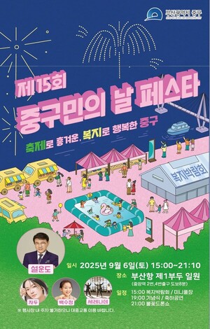 부산광역시 중구(구청장 최진봉)는 오는 9월 6일(토) 오후 3시부터 9시 10분까지 부산항 제1부두 일원에서 ‘제15회 중구민의 날 페스타’를 성대하게 개최한다.‘축제로 흥겨운, 복지로 행복한 중구’를 슬로건으로 내건 이번 행사는 중구민의 날(9월 1일)을 기념해 마련된 지역 최대 규모의 축제로, 제10회 중구복지박람회와 연계해 더욱 풍성한 볼거리와 체험거리를 제공한다.행사장에서는 ▲워터풀 ▲낚시터 ▲빙수 만들기 ▲추억의 문방구 ▲내가 그리는 중구 등 가족 단위 방문객을 위한 놀이 체험이 운영되며, 실내 부두창고에서는 복지 관련