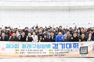 부산 동래구(구청장 장준용)가 주최한 ‘제3회 동래구청장배 걷기대회’가 11월 9일 오전 온천천 인공폭포 앞에서 성황리에 개최됐다. 맑고 청명한 가을 하늘 아래 열린 이번 대회에는 가족 단위 참가자부터 친구, 이웃, 어르신까지 다양한 연령층이 함께해 ‘함께 걷는 동래, 건강한 동래’의 의미를 되새겼다.행사에는 서지영 국회의원, 장준용 동래구청장, 서국보 부산시의원 등 지역 인사들이 참석해 구민들과 발걸음을 맞췄다. 참가자들은 온천천을 따라 걷는 동안 서로 응원의 인사를 나누고 웃음을 공유하며 건강과 행복을 동시에 챙기는 시간을 가졌