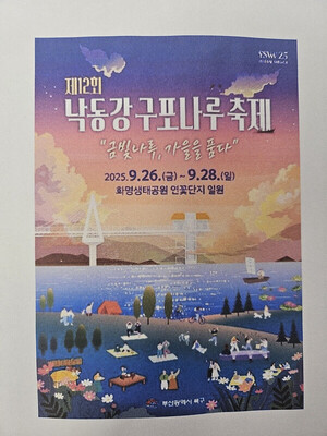 2025년 9월 26일 금요일에서 9월 28일 일요일 3일 간부산 북구 화명생태공원 연꽃단지 일원 에서 제12회 낙동강 구포나루 축제가 개최된다금빛 나루, 가을을 품다라는 주제로옛 구포나루의 역사와 문화를 현대적으로 재해석해 선보인다. 낙동강과 함께한 삶의 이야기를 담아내며, 전통과 현재가 어우러지는 다채로운 프로그램이 준비된다고 한다주요 프로그램으로는 개막식 축하공연 구포나루 가요제 낙동강 버스킹 무대 전통놀이·공예 체험 푸드트럭과 농특산물 장터 등으로 시민이라면 누구나 참여 할수 있다낙동강 구포나루축제는 북구에서 하는 가을 축제