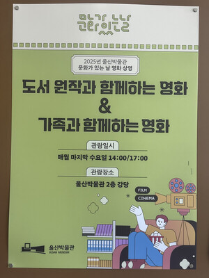 문화가 있는 날 ‘영화상영’ 주제 : 도서 원작 및 가족과 함께하는 영화 기간 : 매월 마지막 주 수요일 14:00, 17:00 장소 : 박물관 강당(2층) 대상 : 관람객 누구나 울산박물관에서 영화도 보고, 전시도 즐기고!매달 마지막 수요일, '문화가 있는 날' 영화 상영이 진행되고 있다.‘도서 원작과 함께하는 영화'(1부), '가족과 함께하는 영화'(2부)라는 주제로 매달 마지막 수요일, 총 2편의 영화를 상영한다.관람은 무료이며, 상영 20분 전부터 선착순으로 입장이 가능하며, 회차당 200명까지 관람할 수 있다.