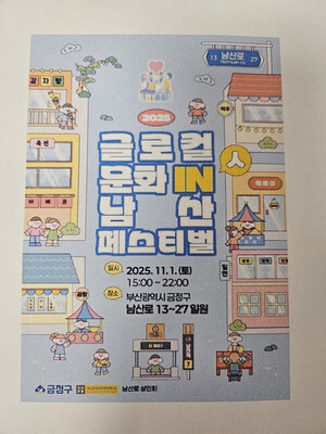 부산광역시에서 글로컬 문화 in(人) 남산 페스티벌을 개최한다. 2025 글로컬 문화 in(人) 남산 페스티벌은 글로벌 문화와 남산동의 지역 문화를 한 자리에서 만나볼 수 있는 글로컬 문화 축제이다. 지역주민과 부산외국어대학교 학생들이 운영하는 다양한 글로컬 전시,체험 프로그램을 비롯하여 남산동 상인회가 이번 축제를 위해 개발한 글로컬 메뉴가 준비된다. 글로컬한 분위기로 조성되는 남산로 거리에서 가족, 친구, 연인과 함께 글로컬한 문화 공연과 체험을 즐길 수 있다.[날짜]2025.11.01[장소]부산광역시 금정구 남산로 27 (남산