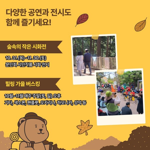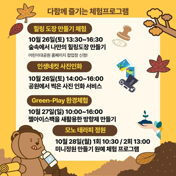 이번 행사에서는 나만의 힐링 도장 만들기, 인생네컷 촬영, 자연과 함께하는 방향제 만들기 등 다양한 체험 프로그램이 제공된다.