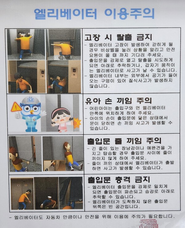 어린아이들이 버튼, 인터폰, 비상 정지 스위치 등을 장난으로 조작하지 않도록 주의시키고, 정전, 고장 등으로 엘리베이터가 멈췄을 경우 당황하지 말고 인터폰으로 구조를 요청해야 합니다.