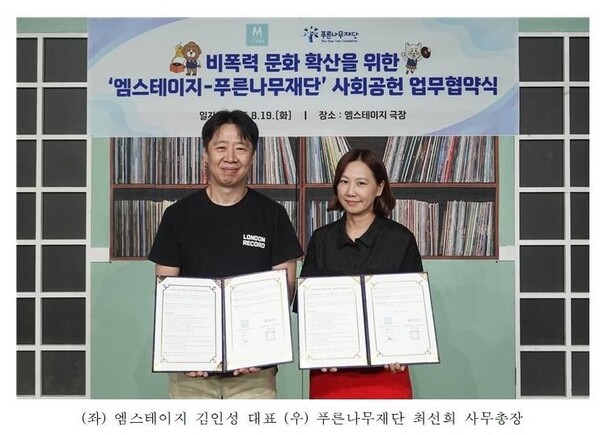 푸른나무재단(이사장 박길성)은 8월 19일 뮤지컬 제작사 엠스테이지(대표 김인성)와 함께 청소년 대상 학교폭력 및 사이버폭력 예방을 위한 비폭력 문화 확산 업무협약을 체결했다고 밝혔다.